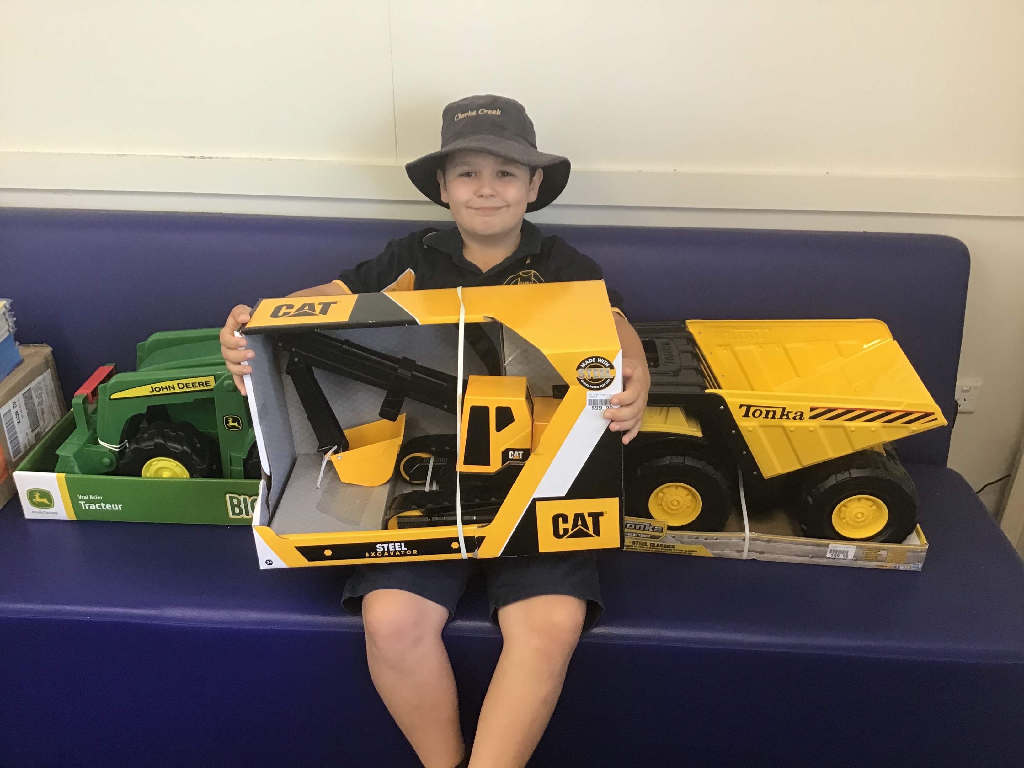 He wanted some more trucks for our sandpit, so there would be more to share. He decided to write a letter to the P&C asking for funding. They agreed, and asked him to decided what to get. Here he is with the trucks he chose.